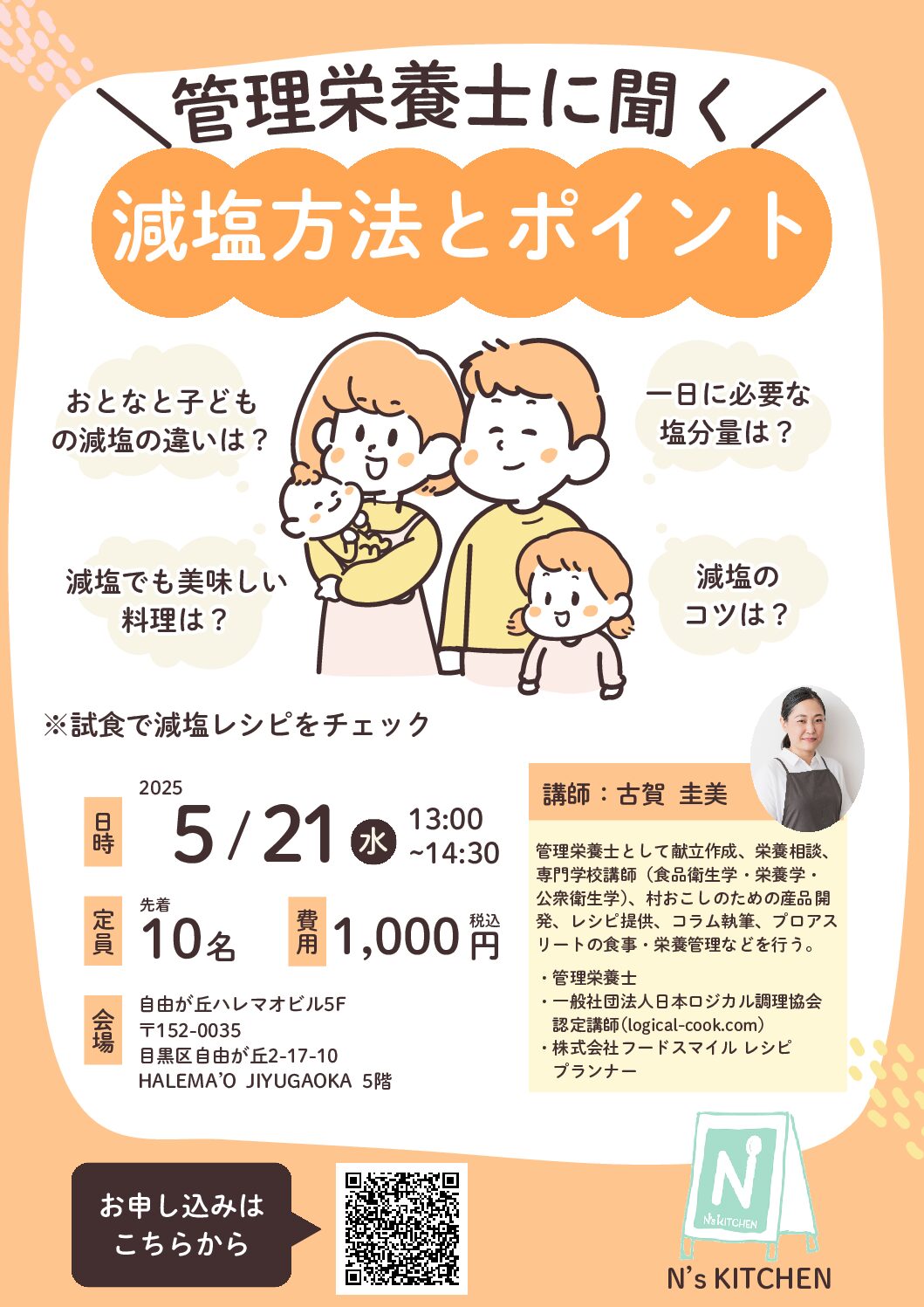 【お知らせ】5月21日開催~管理栄養士に聞く減塩方法とポイント~セミナー開催のお知らせ(N’s KITCHEN様主催)